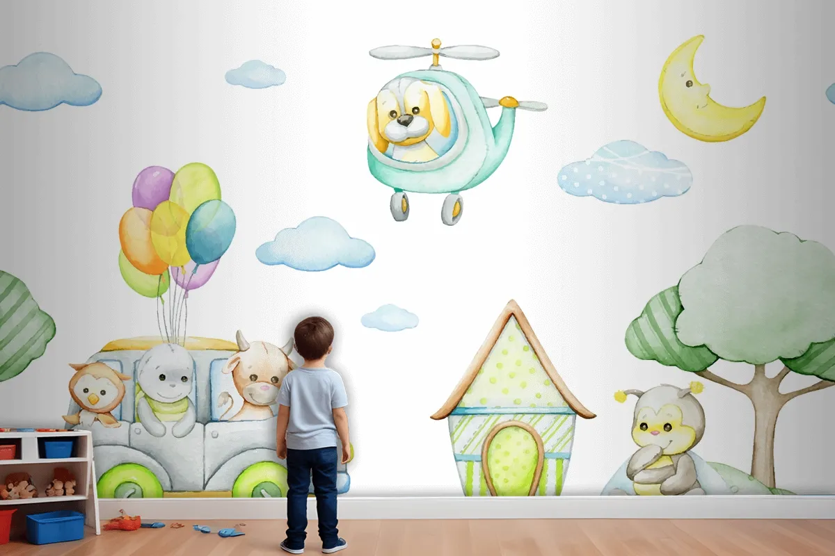 Aquarell Nahtloses Muster Im Cartoon Stil Tropische Tiere Auto Hubschrauber Mond Fototapete