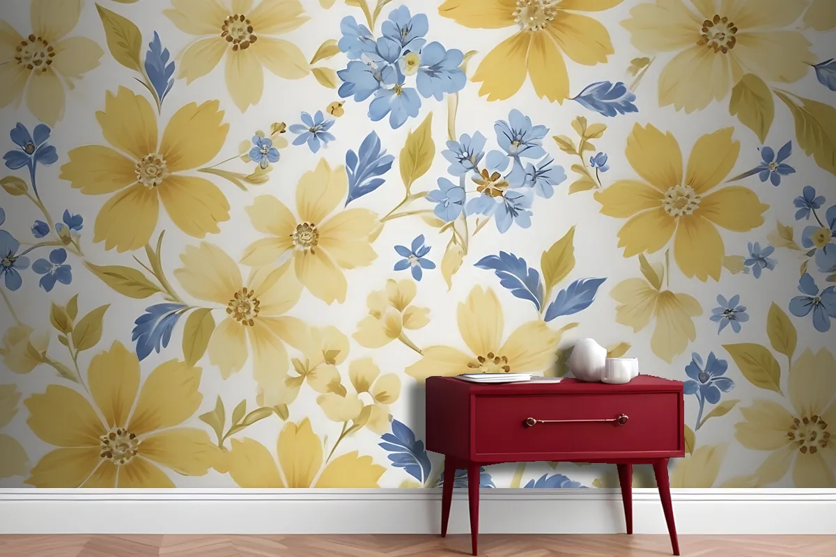Blumenmuster Mit Großen Gelben Blumen Und Kleineren Blauen Blumen Auf Weißem Tapetenwandbild