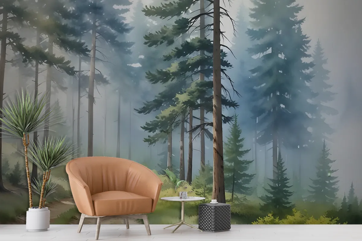 Fototapete Aquarellmalerei Nebelige Waldlandschaft