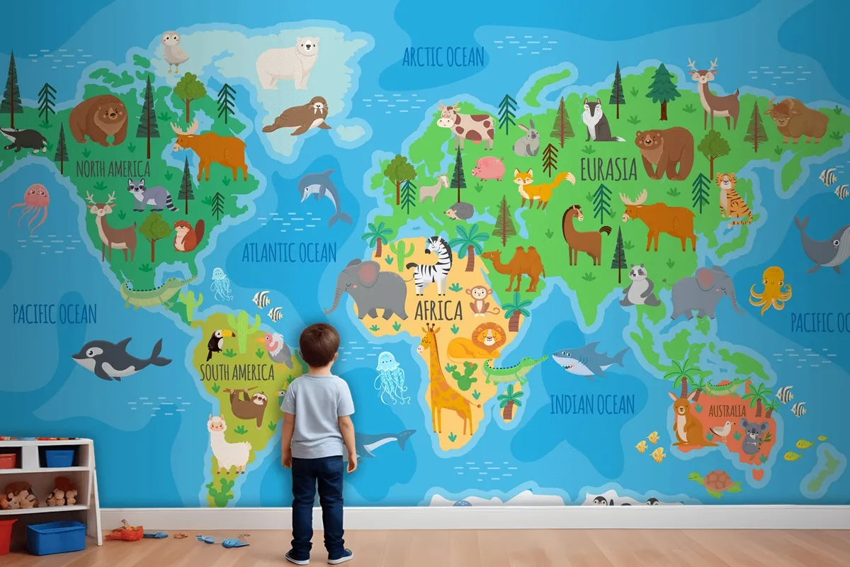 Fototapete CartoonWeltkarte Für Kinderzimmer Mit Waldtieren