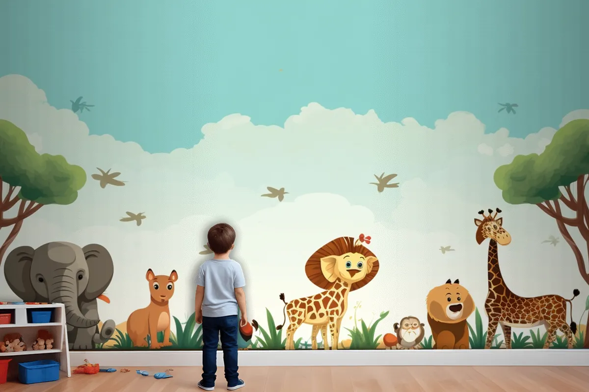 Fototapete Ein Cartoon Mit Giraffen Und Giraffen Auf Einem Feld Mit Tieren