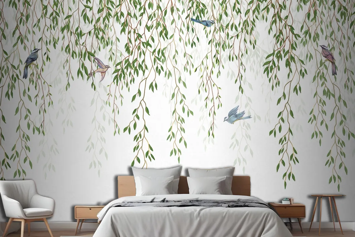 Fototapete Hängende Weidenzweige Mit Vögeln Auf Weißem Hintergrund