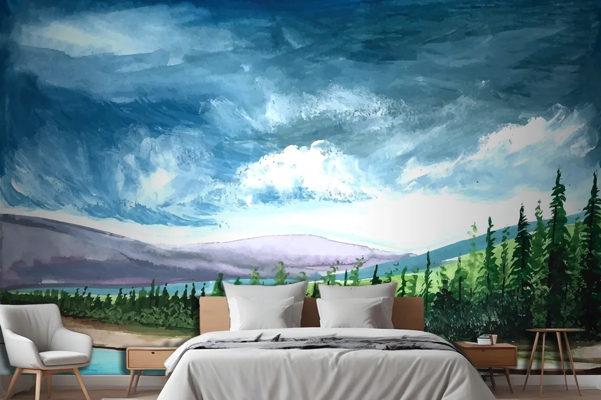 Fototapete Handgezeichnete Frühlingslandschaft Mit Aquarell