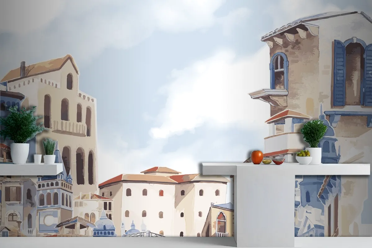 Fototapete Mediterrane Stadtgebäudeaußenseite Im Aquarellstil