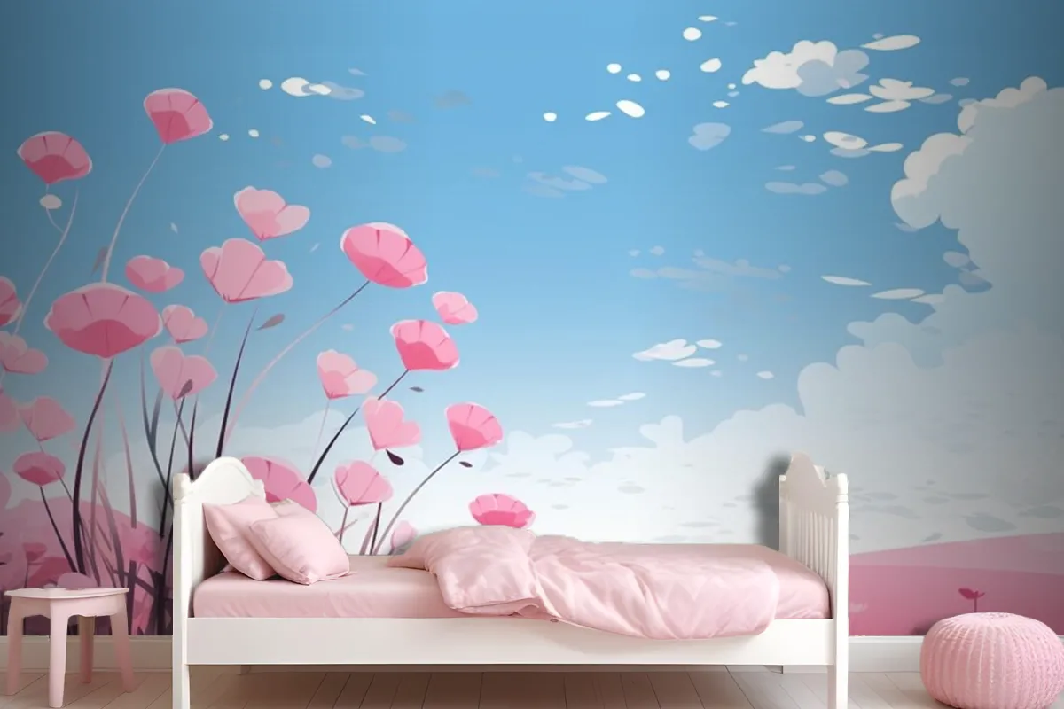 Fototapete Rosa Herzen Im Himmel Mit Blumen Und Wolken