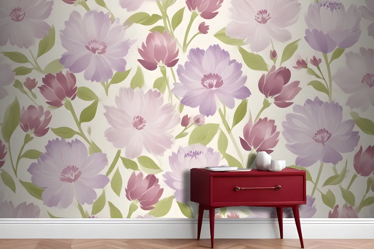 Fototapete RosaLila Blumen Mit Grünen Blättern Auf Hellem Untergrund