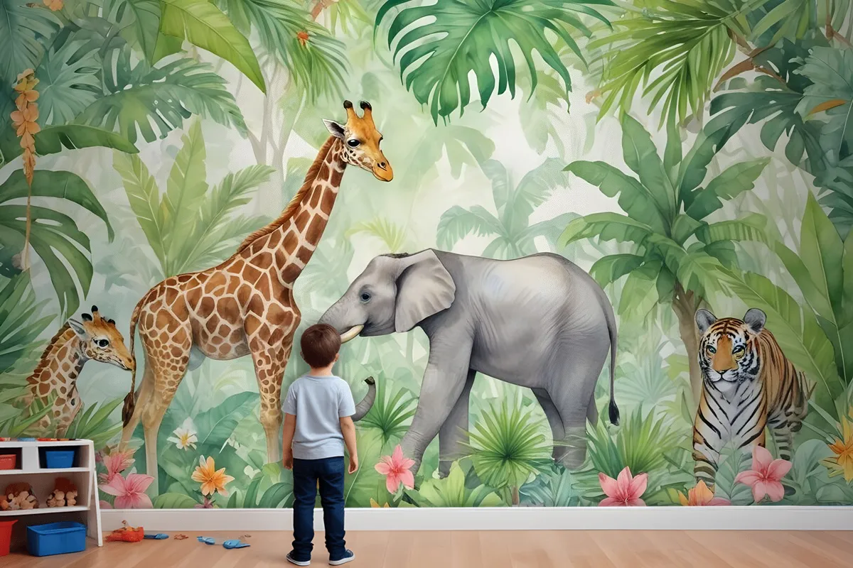 Fototapete Safari Für Kinder Mit Tropischen Waldtieren Und Aquarellen
