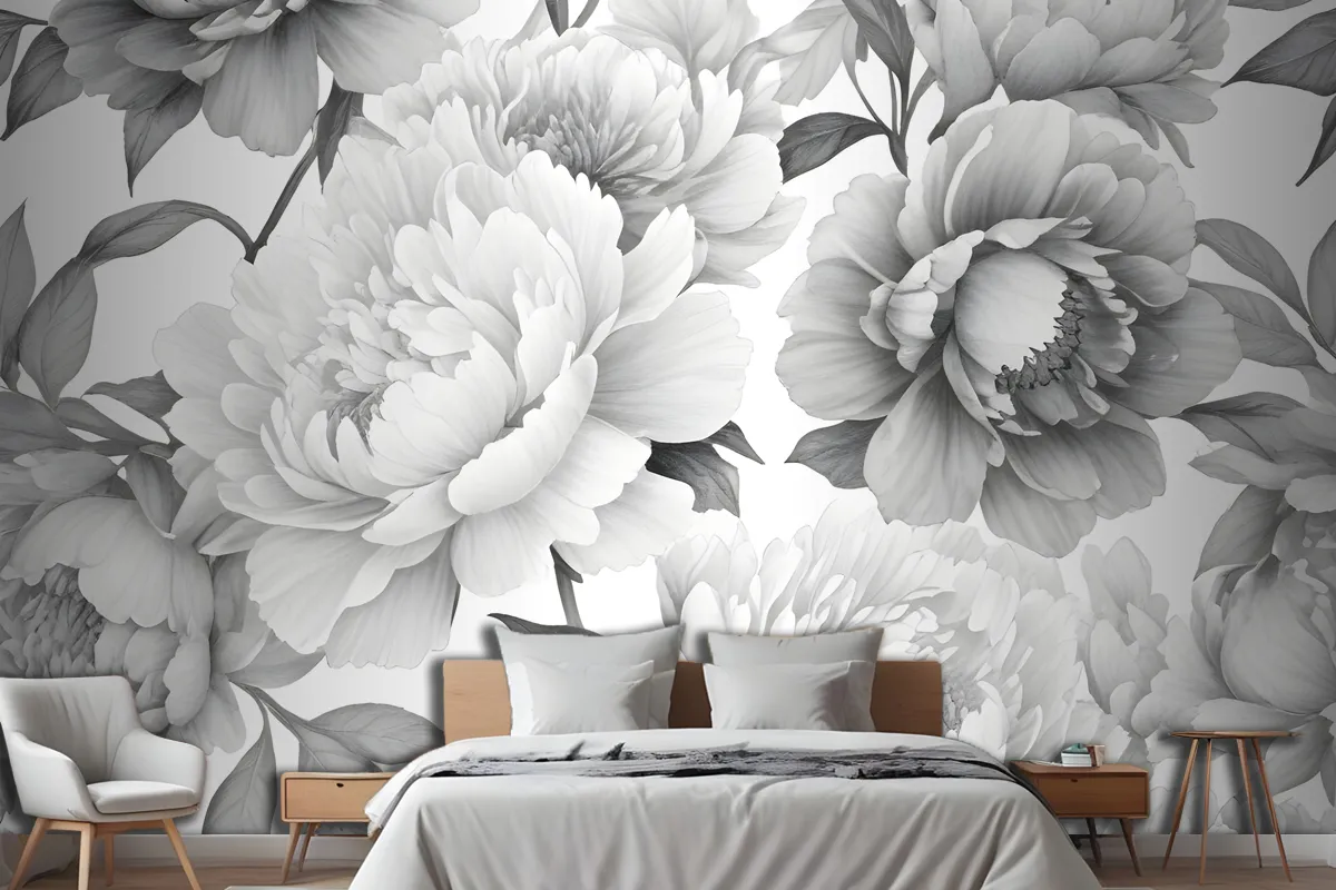 Fototapete SchwarzWeißes Blumenmuster Mit Großem Üppigem Muster