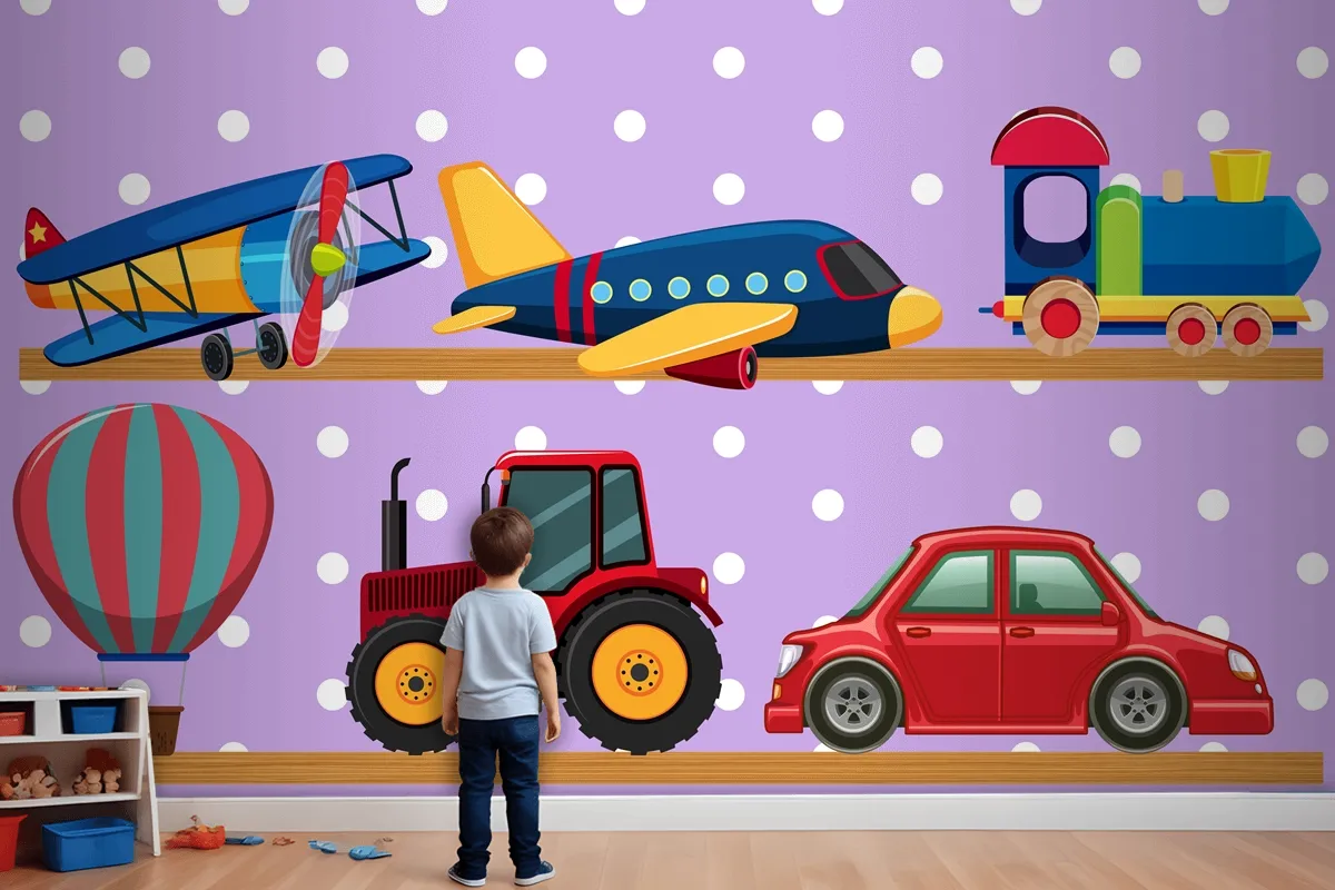 Fototapete Viele Transportspielzeuge Auf Holzregalen