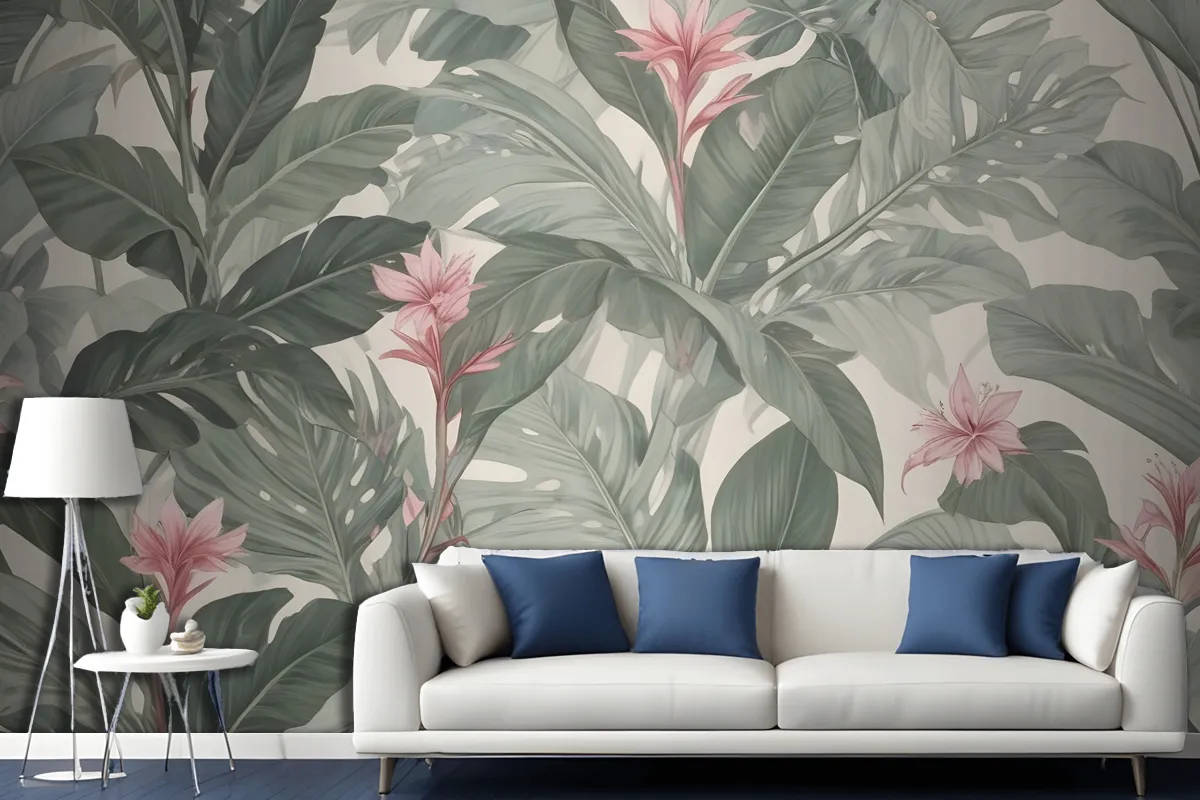 Heller Hintergrund Große Grüne Blätter Rosa Blumen Tropisches Laubmuster Fototapete